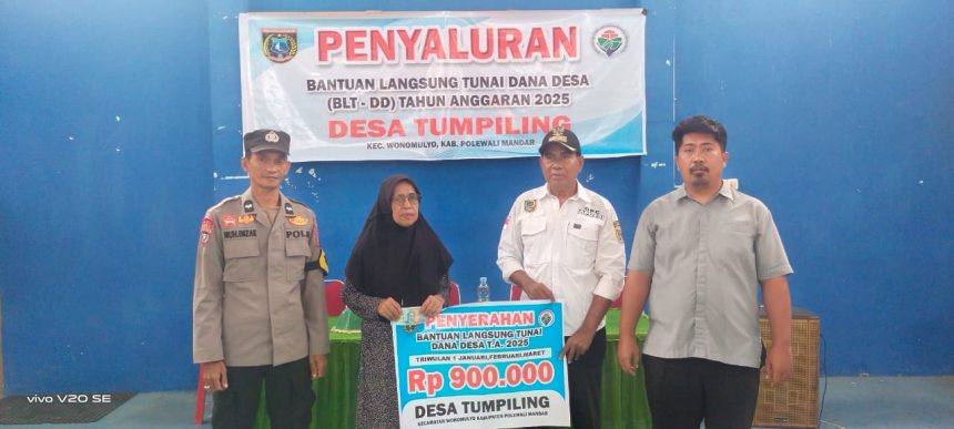 POLMAN – Bhabinkamtibmas desa Tumpiling Polsek Wonomulyo Aipda Muh Imzak menghadiri kegiatan penyaluran Bantuan Langsung Tunai (BLT) Dana Desa Triwulan I Tahun 2025 yang dilaksanakan di Desa Tumpiling, Kecamatan Wonomulyo, Kabupaten Polewali Mandar. Rabu (18/06/25)