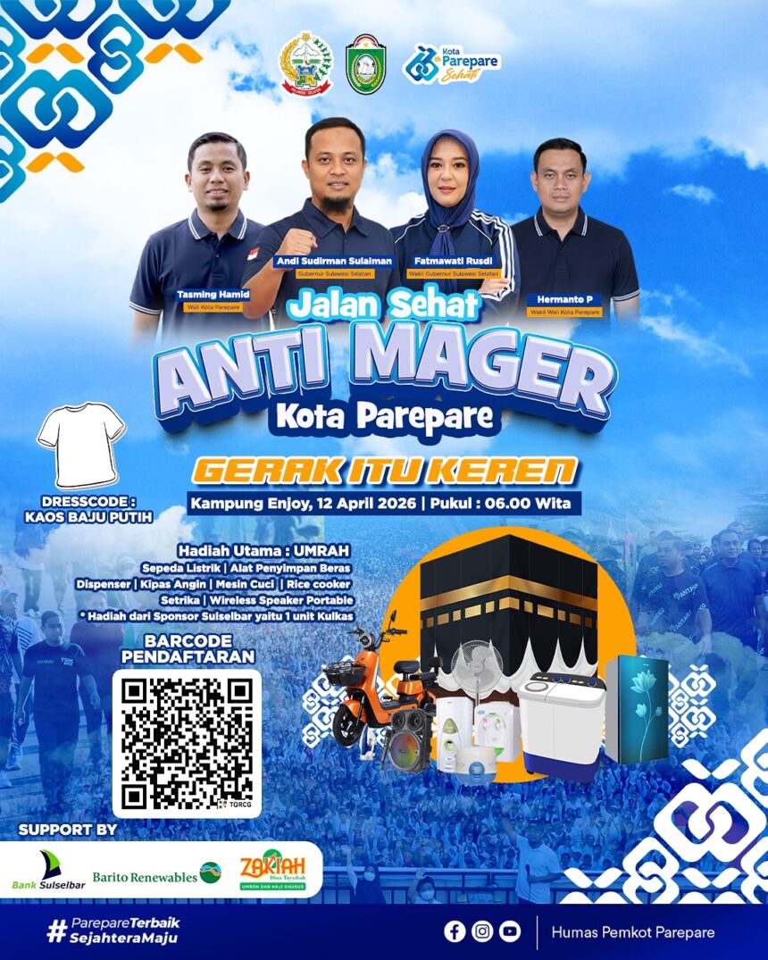 PAREPARE — Pemerintah Kota Parepare kembali mengajak masyarakat untuk hidup sehat. Kali ini, ajakan tersebut dikemas melalui kegiatan bertajuk Jalan Sehat Anti Mager 2026. Informasi kegiatan ini disampaikan melalui akun…