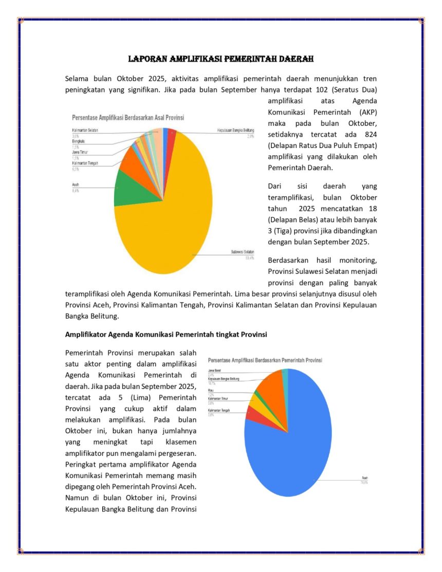 Laporan nasional itu juga mencatat lonjakan signifikan aktivitas komunikasi pemerintah pada Oktober 2025, dari 102 menjadi 824 amplifikasi di tingkat nasional. Di posisi puncak, nama Kabupaten Barru kembali menegaskan eksistensinya, sejajar dengan berbagai daerah besar lainnya.