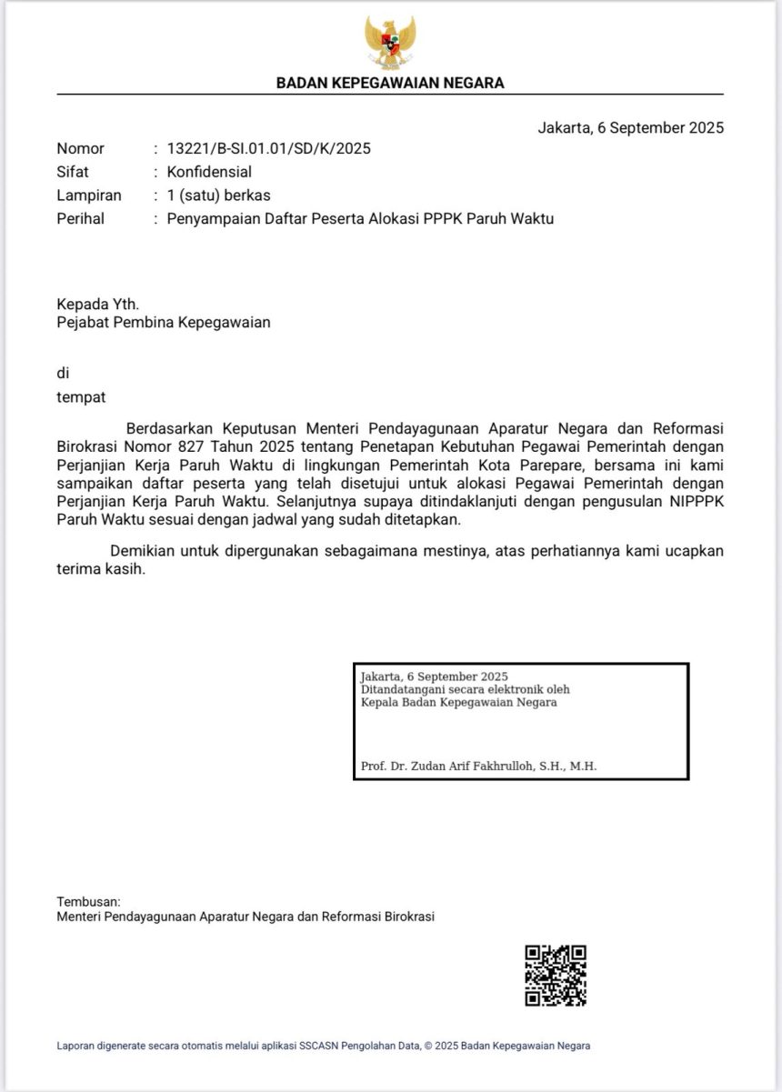 Surat BKN bernomor 13221/B-SI.01.01/SD/K/2025 tertanggal 6 September 2025 itu diterima Pemkot Parepare pada Senin, 8 September 2025 sekitar pukul 12.00 WITA.