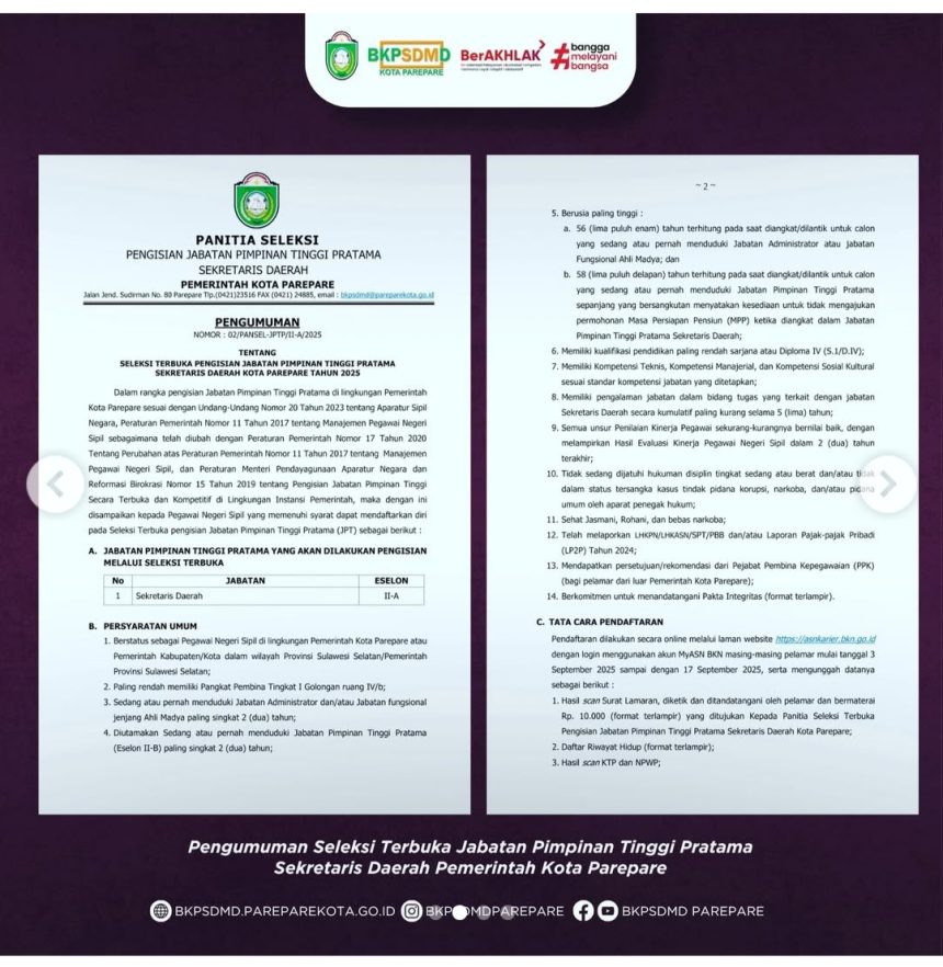 Informasi lengkap mengenai persyaratan, tata cara pendaftaran, dan jadwal seleksi dapat diakses melalui kanal resmi BKPSDMD dan Pemerintah Kota Parepare.