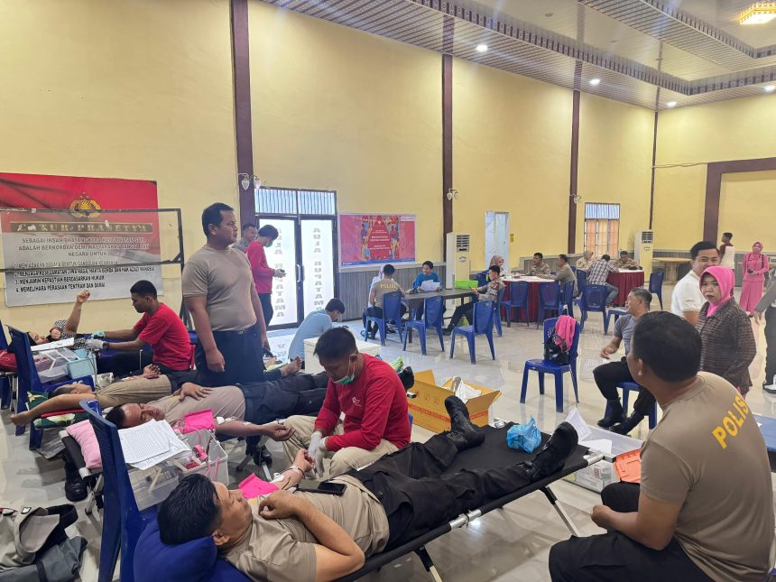 POLMAN – Dalam rangka menyambut Hari Ulang Tahun (HUT) Bhayangkara ke-79, Kepolisian Resor (Polres) Polewali Mandar bekerja sama dengan Unit Transfusi Darah (UTD) PMI Polman melaksanakan kegiatan donor darah di Aula Rupatama Polres Polman, Selasa (17/06/25)