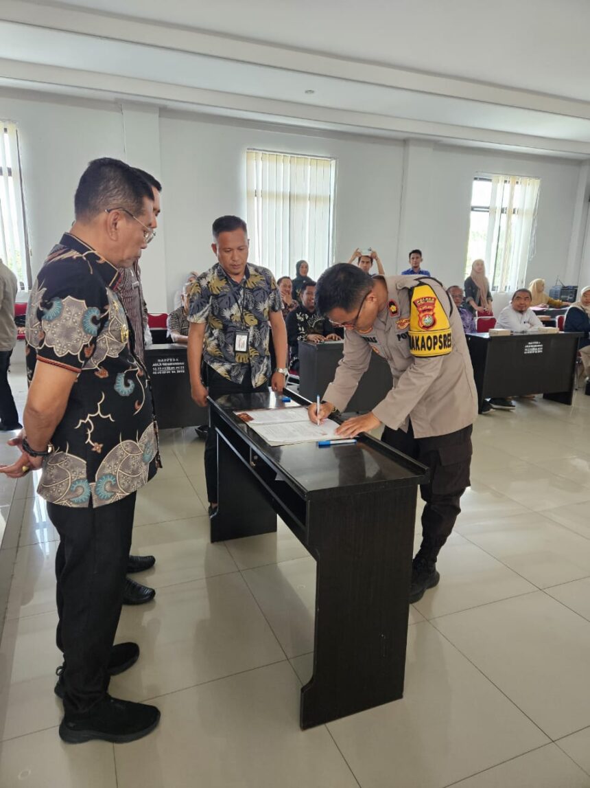 POLMAN, KORIDOR.ID – Wakapolres Polman, Kompol Kemas Aidil Fitri, turut hadir dalam acara penandatanganan Nota Kesepakatan Kerjasama antara Pemerintah Kabupaten Polman dan sejumlah lembaga instansi vertikal terkait penyelenggaraan pelayanan di Mall Pelayanan Publik (MPP) Kabupaten Polman di aula Balitbangren Kab. Polman Jl. Manunggal Kel. Pekkabata Kec. Polewali Kab. Polman, Kamis (14/11/2024).